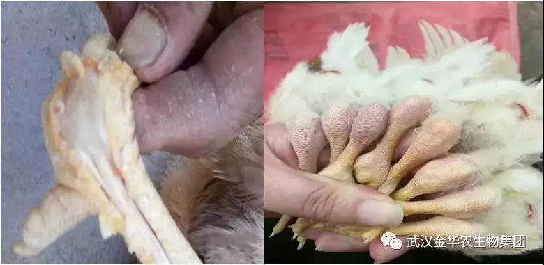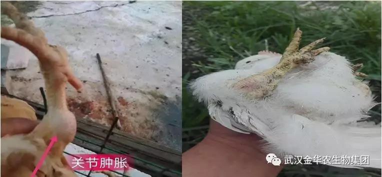 劉姐開始用替米考星加上鹽酸多西環素用了10天,效果不理想,后來加了4天強力霉素和泰勒菌素,癥狀減輕但是腫脹依舊明顯,出現了越來越多的癱雞,極度消瘦,精神沉郁的病雞。劉姐晚上翻來覆去睡不著,翻閱網上各種資料,后來看到有一個產品叫滑囊藍金”方案還不錯,就抱著試試的態度在網上找到了華中農業大學校企合作單位---武漢金華農生物科技有限公司,禽病技術專家姚教授、趙教授確診為滑液囊支原體后推薦劉姐使用滑囊藍金”方案。連用7天一療程。
