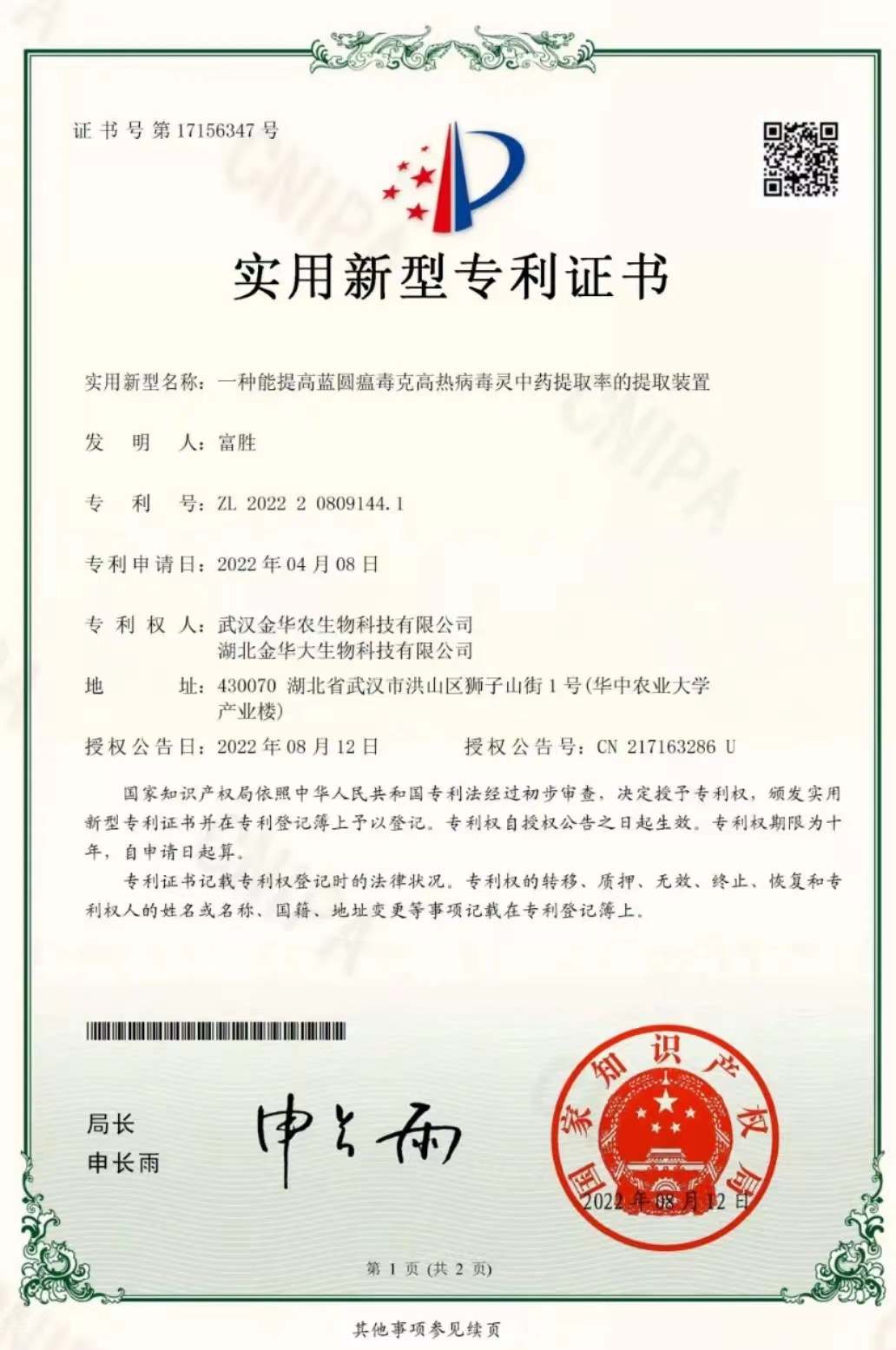科技專利證書(高熱病毒靈):專利號—202220809144.1