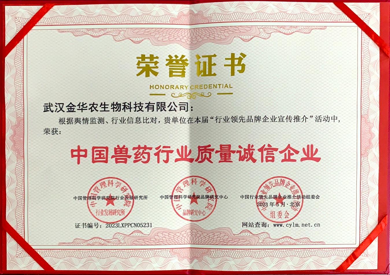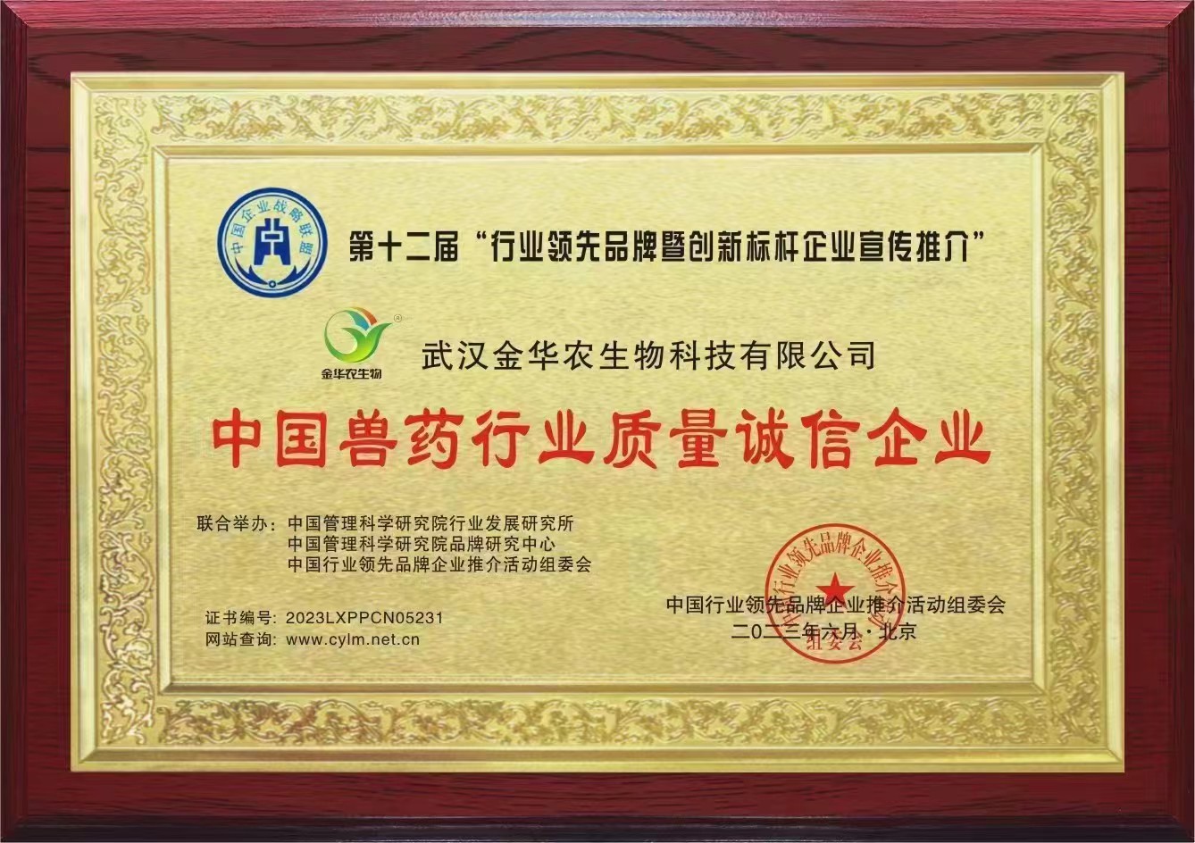 卯兔年未過半,武漢金華農已迎來諸多利好消息。公司業績突飛猛進,銷量翻番;公司獲得省農業農村廳第一批新版GMP獸藥文號、飼料添加劑45個新品種批號;公司憑借專業技術、創新發展、高效服務,被國家信用平臺、品牌強國計劃評選為“獸藥飼料添加劑行業典范企業”。近日,公司又在中國科學研究院組織的全國自主品牌研發、科研創新產品、質量品控管理、高校產學研基地建設的評選活動中,經嚴格篩選,層層選拔,考核評比,監督審查,被中國科學研究院組委會授予“中國獸藥行業質量誠信企業”榮譽。