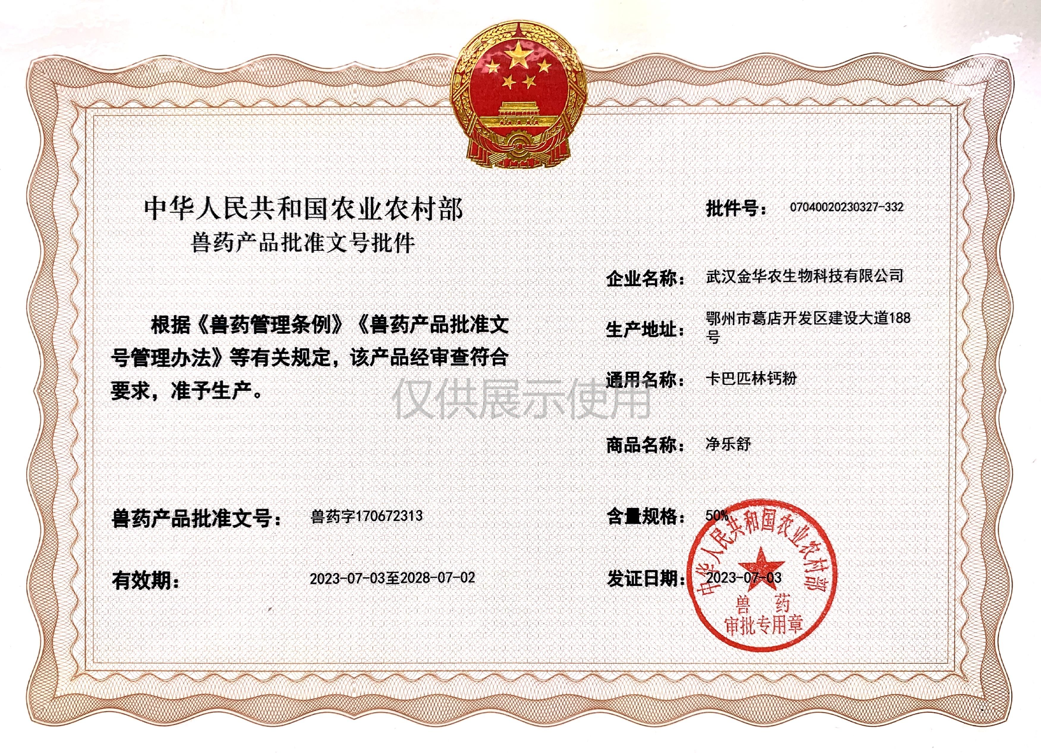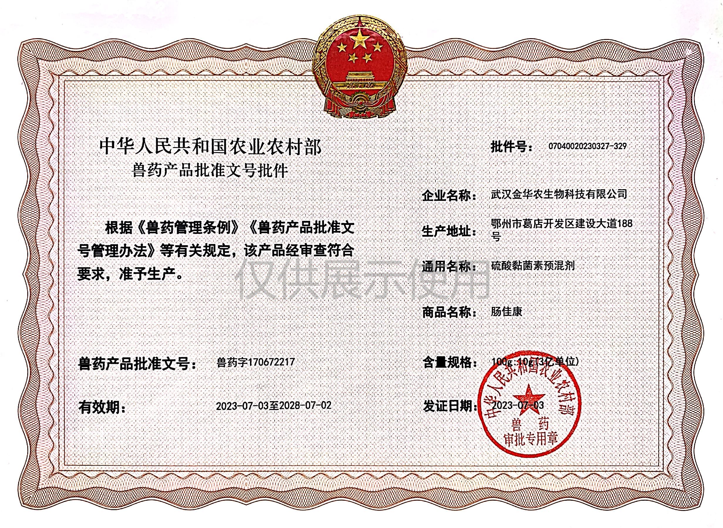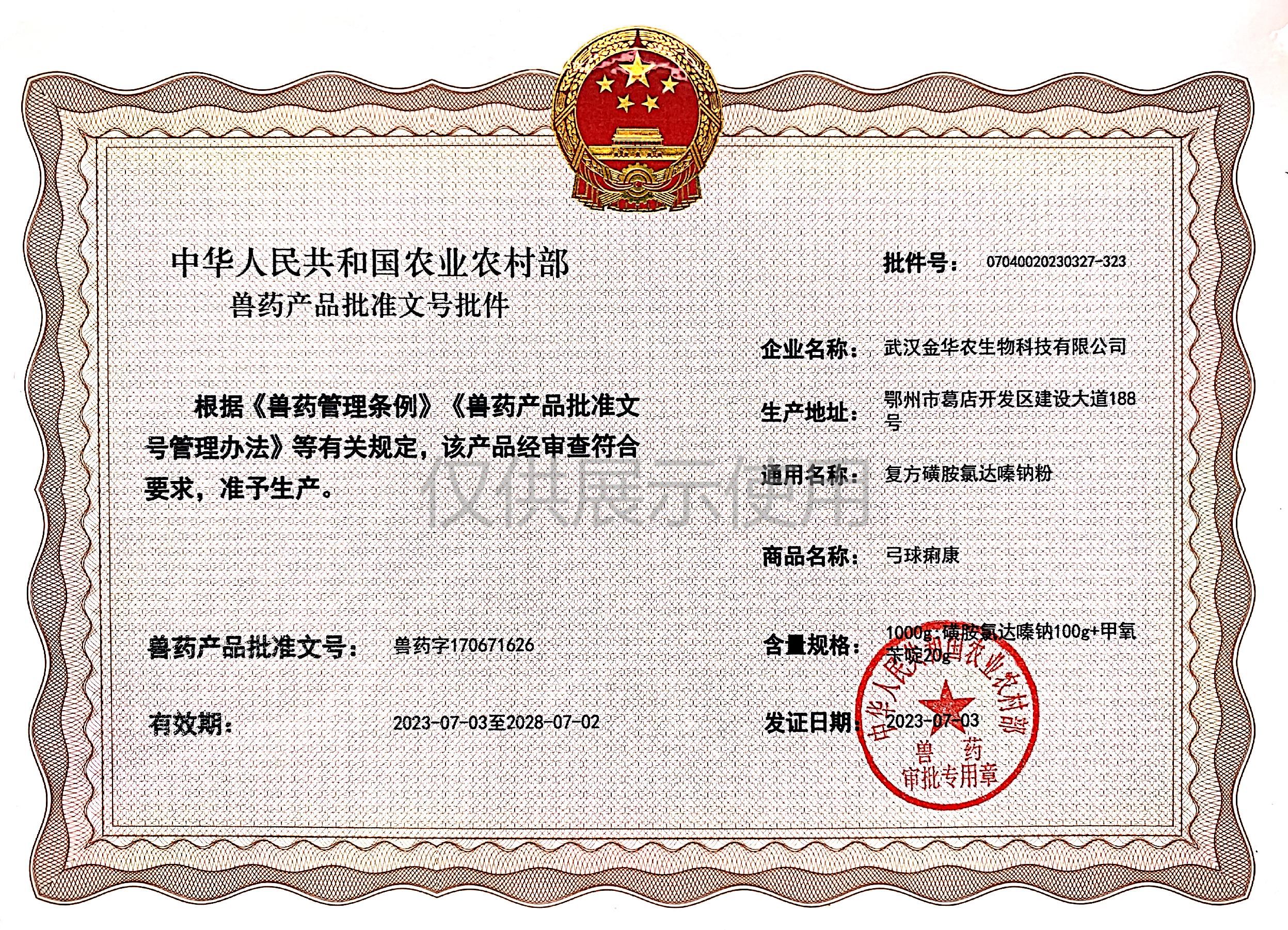 根據《獸藥管理條例》和《獸藥產品批準文號管理辦法》的規定,經農業農村部審查,準予核發武漢金華農生物科技有限公司(以下簡稱“武漢金華農生物”)國家新版GMP9種獸藥相關產品批準文號,這是今年獲取的第三批獸藥產品批準文號,截至目前,我司已獲得農業農村部頒發的新版GMP獸藥文號20個