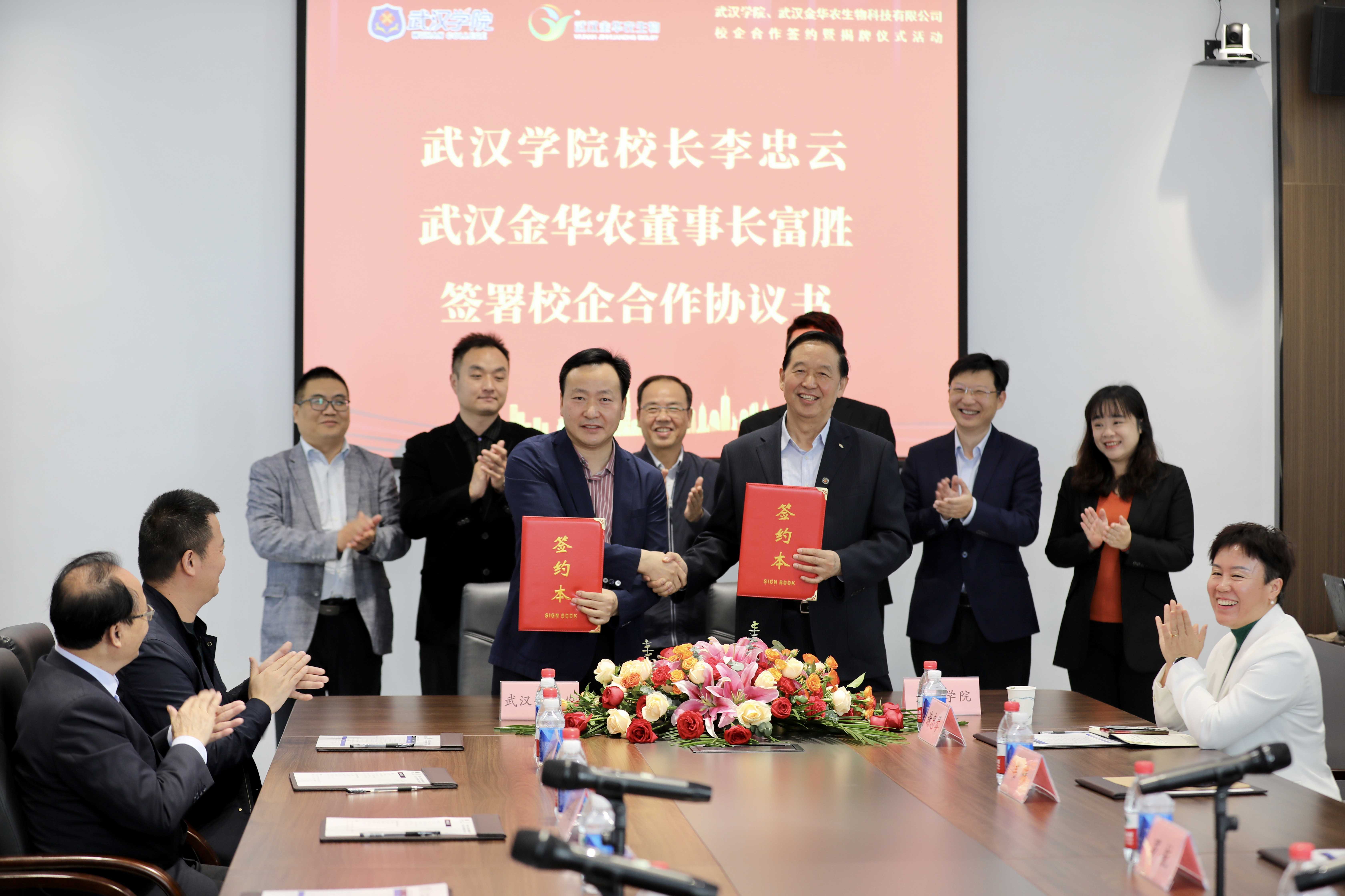 武漢學院校長李忠云、副校長羅航、管理學院院長李延暉、教務處處長韋瑋、金融與經濟學院副院長周利、教務處副處長謝忠琴、學生工作處副處長戚蘭,武漢金華農生物公司董事長富勝、副總經理黃凡、市場總監(jiān)郭昌盛、人事總監(jiān)梅寒、技術總監(jiān)吳志良、湖北分公司總經理劉總、山東分公司總經理徐總及公司相關代表出席簽約儀式。會議特邀原湖北省總工會黨組書記、常務副主席馬建中參加見證簽約揭牌儀式。