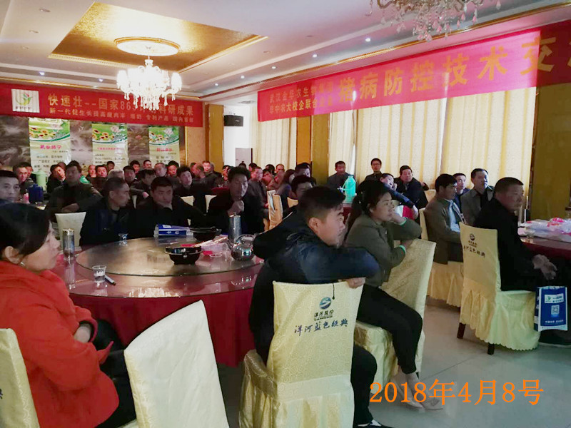 2018年4月8日,武漢金華農生物安徽霍邱縣豬病防控暨技術交流會勝利召開!公司副總經理徐巍博士應邀出席并參加。本次會議由安徽區域戰略合作伙伴黃總和安徽大區吳先鋒經理共同策劃與組織,由華中農業大學動物醫學院帥起義教授主講,參會豬場老板達到80多人,會場氣氛熱烈而友好,會議效果良好,武漢金華農產品質量和臨床療效受到養殖戶的高度認可與贊美。雖然該地區是新市場,第一次組織會議,但現場訂貨高達20多萬元,后期跟蹤服務高達40多萬元,遠超預期。祝賀安徽大區首場豬病會議旗開得勝!好獸藥,武漢金華農造!!