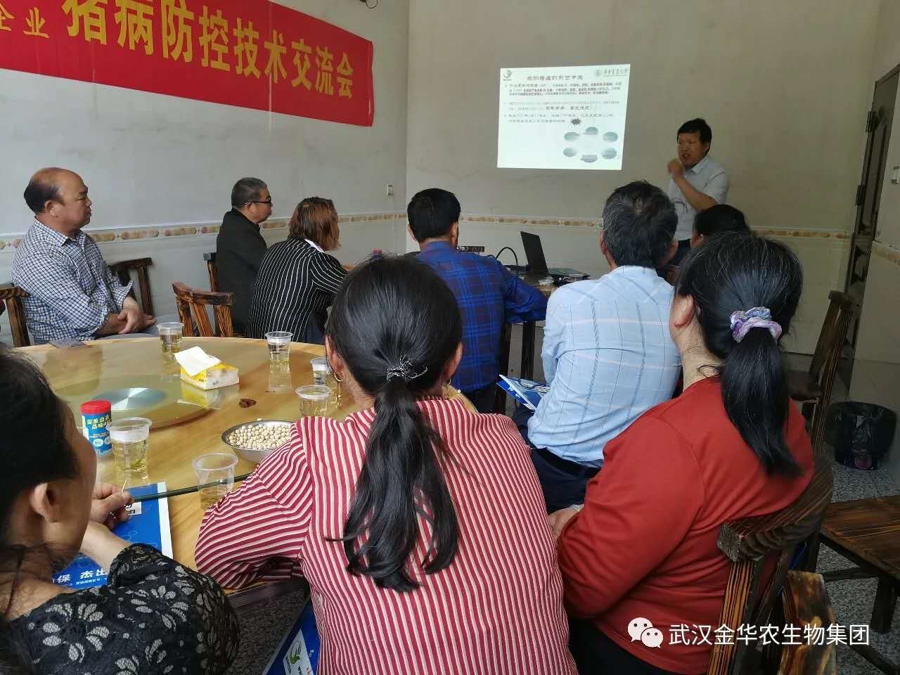 2019年4月25日,武漢金華農生物集團應湖南衡陽畜牧局主管單位邀請,在湖南衡陽湘鄉區域成功舉辦豬病圓桌交流會議,與會養豬戶30家,反饋效果明顯,現場訂貨積極,會議氣氛友好而熱烈。畜牧局領導李局長對這次科技下鄉活動十分重視,湖南衡陽當地戰略合作伙伴錢總出席參加本次會議。