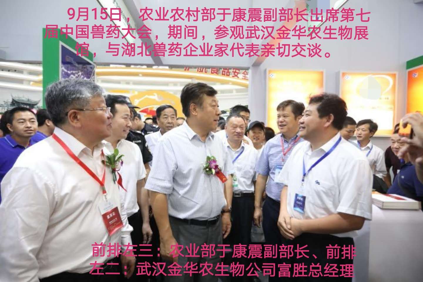 會議期間,于康震副部長參觀并視察了湖北省獸藥企業展館,親自來到武漢金華農生物集團展館前了解企業發展情況,傾聽民聲民情,為企業解決疑難問題,關心湖北省獸藥企業的發展情況!仔細聆聽了以富勝總經理為代表的湖北省獸藥企業家的工作匯報!并點頭微笑,肯定與贊美湖北省獸藥企業發展良好,為人民的食品安全作出貢獻!肯定武漢金華農生物的發展迅速,科技創新突破,并鼓勵大干快上,為社會和行業作出應有的貢獻,承擔應有的社會責任!