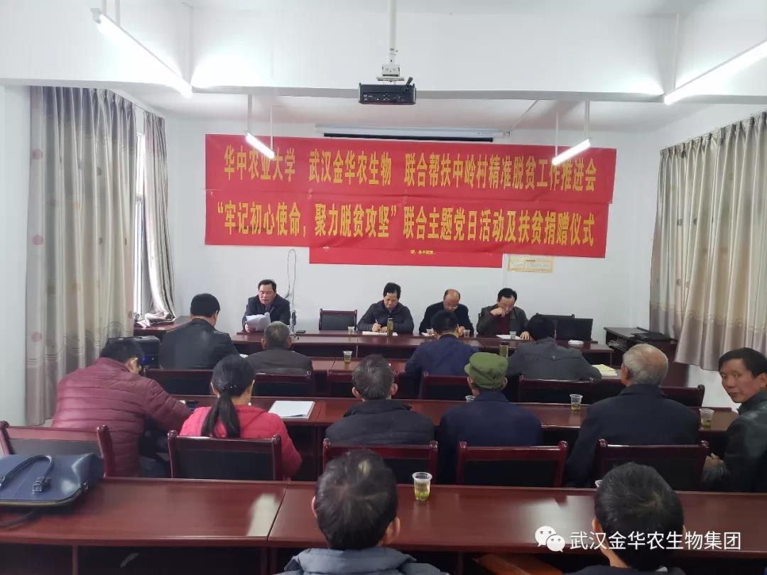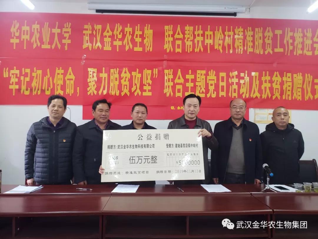 11月12日—14日,華中農業大學財資部黨總支書記李仁剛、武漢金華農生物公司董事長富勝、校資財部支部委員代表和公司扶貧組成員一行,前往華中農業大學扶貧點建始縣,赴官店鎮中嶺村開展 “牢記初心使命,聚力脫貧攻堅”聯合主題黨日活動暨 “校企聯合”助力脫貧攻堅捐贈儀式。